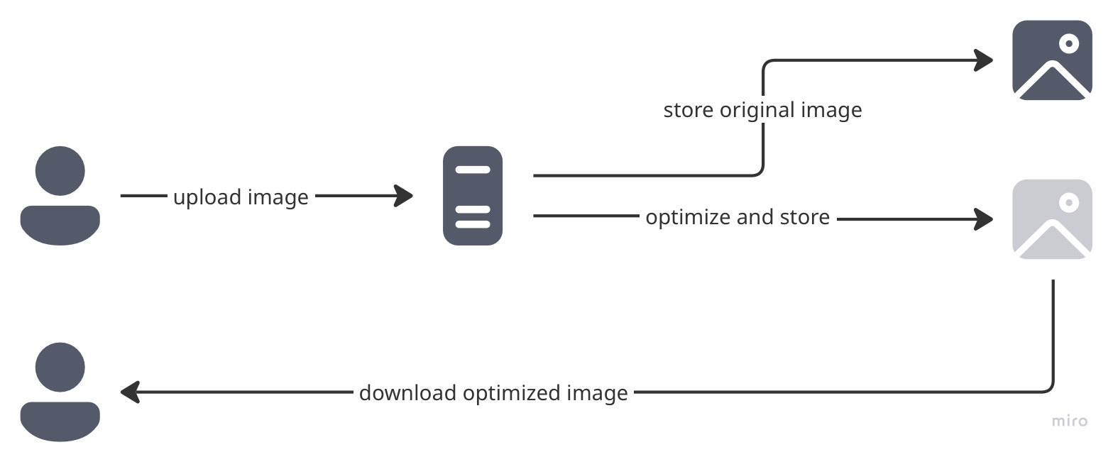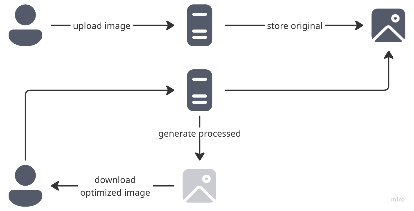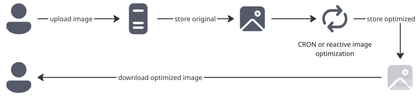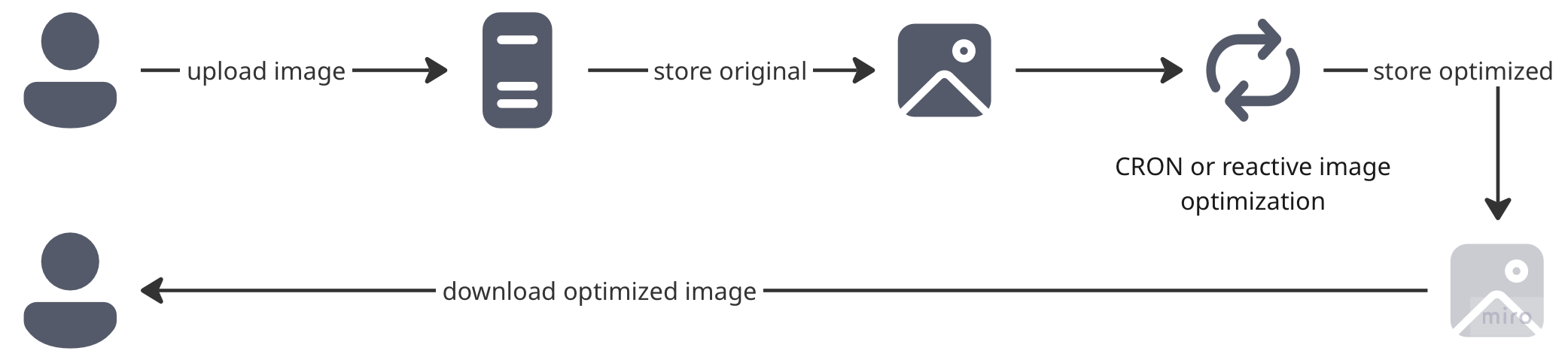 Strategy: OK, so now the server just stores the original image and another service reacts to file creation or runs regularly to process new images and store optimized versions.